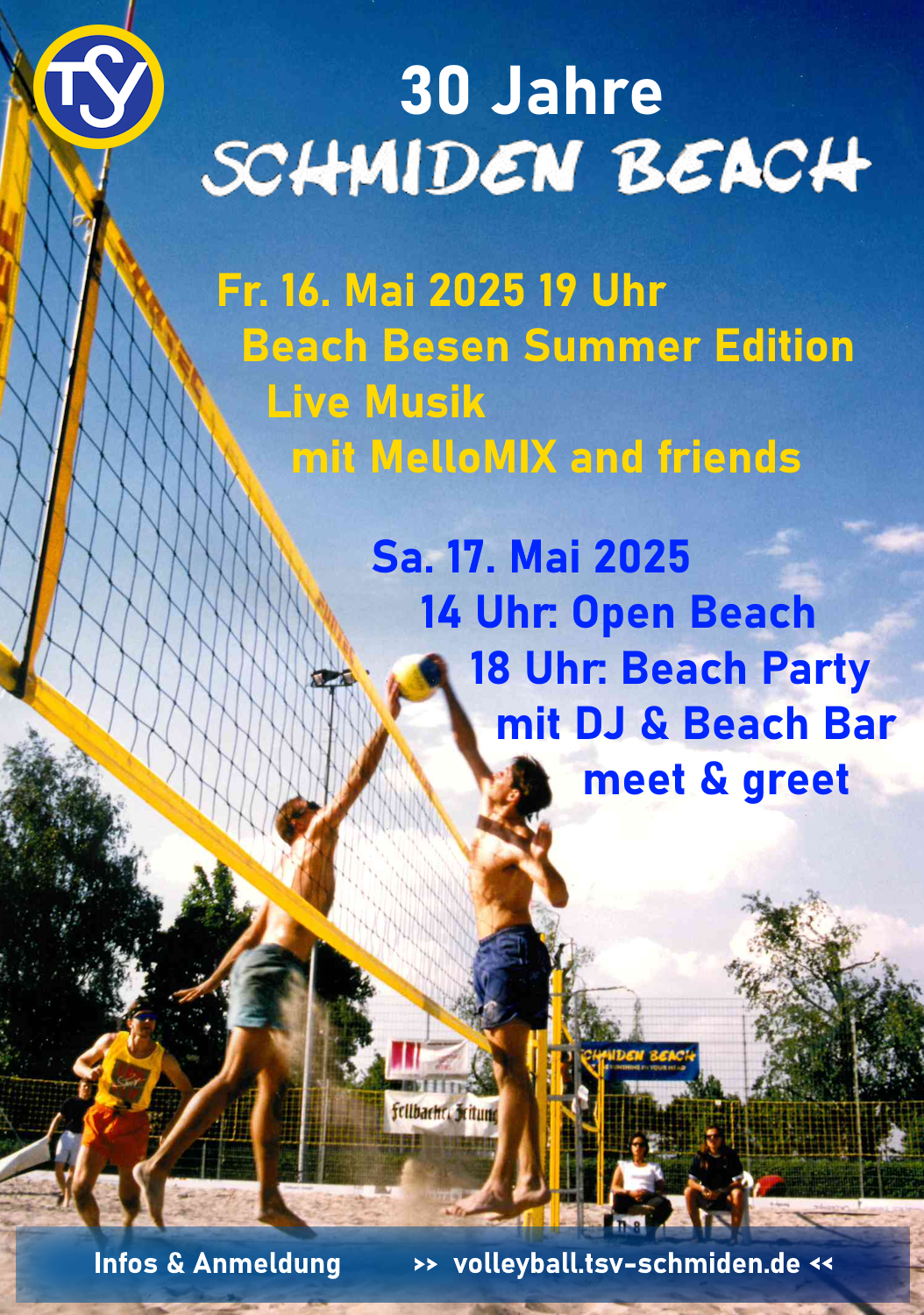 Zum 30-jährigen Jubiläum feiern wir am Freitag, 16.05., und Samstag, 17.05.2025, zwei Tage lang ein großes Fest für Jung und Alt, Freizeit- und Profi-(Beach-)Volleyballer aus Nah und Fern am Schmiden Beach!